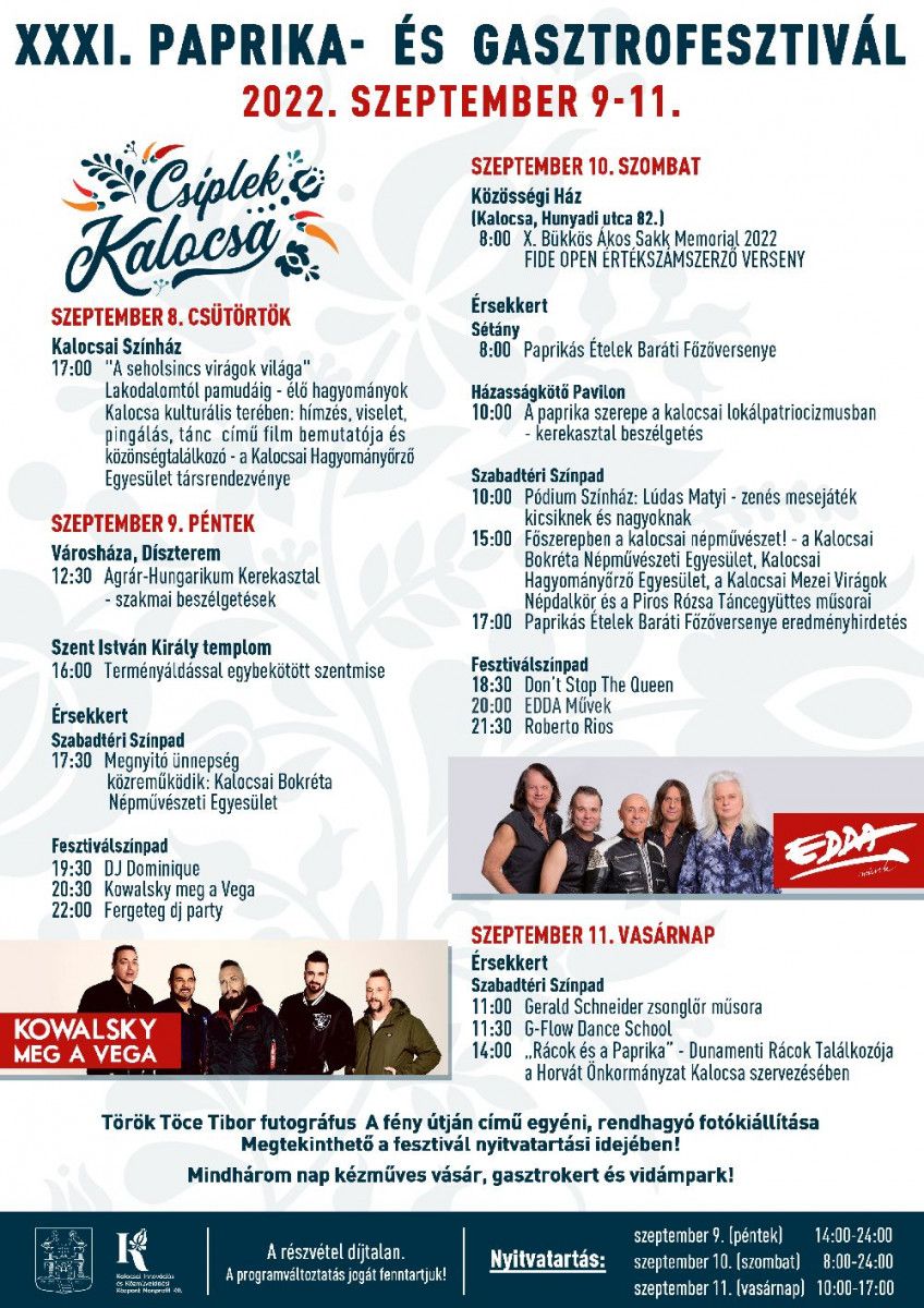 Mint elhangzott, újdonság az is, hogy a Horvát nemzetiségi Önkormányzat Kalocsa a KIKK-el társszervezésben szeptember 11-én, vasárnap 14 órától az érsekkerti szabadtéri színpadon tartja a „Rácok és a paprika” – Dunamenti Rácok Találkozója című rendezvényét. Az Érsekkertben, a Paprikafesztivál nyitvatartási idejében Török Töce Tibor fotográfus A fény útján című egyéni, rendhagyó fotókiállítását is meg lehet majd tekinteni azokon a fainstallációkon, amelyeket a kert különböző pontjain állítanak fel.