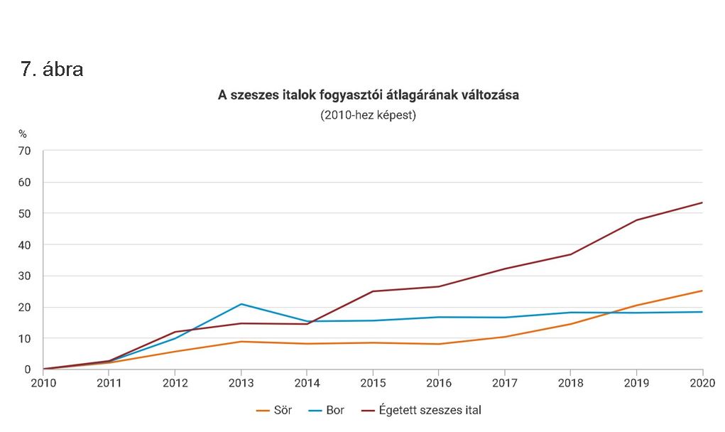 2017 és 2019 között az éves drágulás kissé felerősödött. Az áremelkedés mértéke 2020-ban elmaradt az előző évitől, többek között a járvány miatt megváltozott keresleti-kínálati viszonyok hatására. Összességében 2020-ban a sör ára átlagosan 25%-kal magasabb volt 2010-hez képest, az általános árszínvonalhoz hasonló mértékben változott. Ebben az időszakban a sör a bornál valamivel nagyobb, az égetett szeszes italoknál viszont jóval kisebb mértékben drágult.