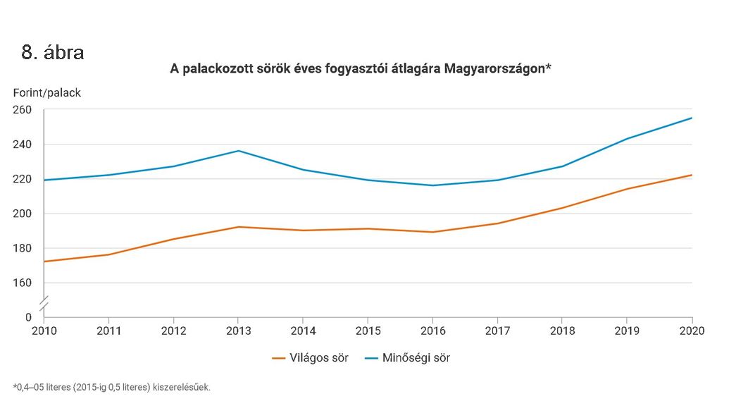 2010 és 2020 között a hagyományos világos sörök ára nagyobb mértékben emelkedett, mint a minőségi söröké, így a köztük lévő árkülönbség szűkült. 2010-ben a palackozott világos söröket a minőségi söröknél átlagosan 27, 2020-ban már csak 15%-kal olcsóbban kínálták.