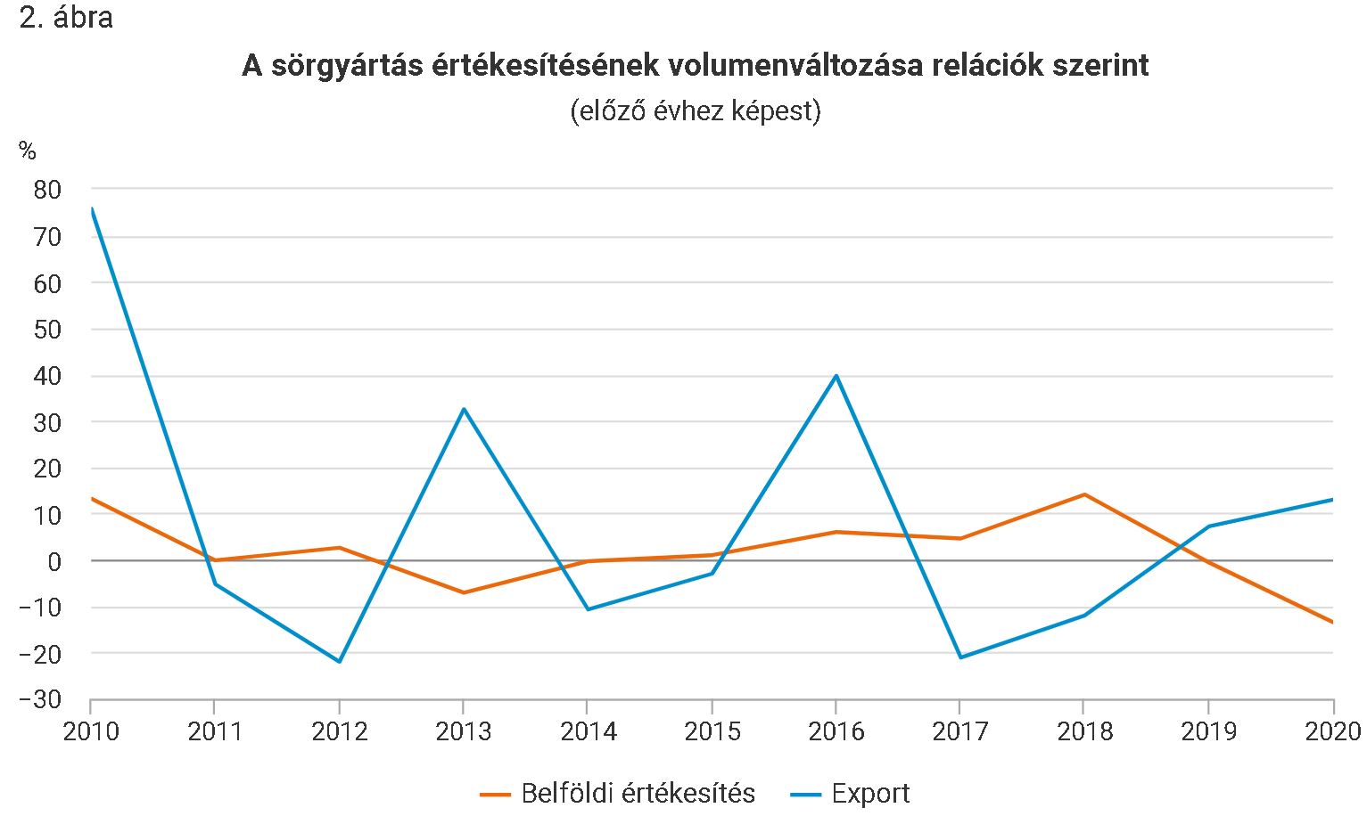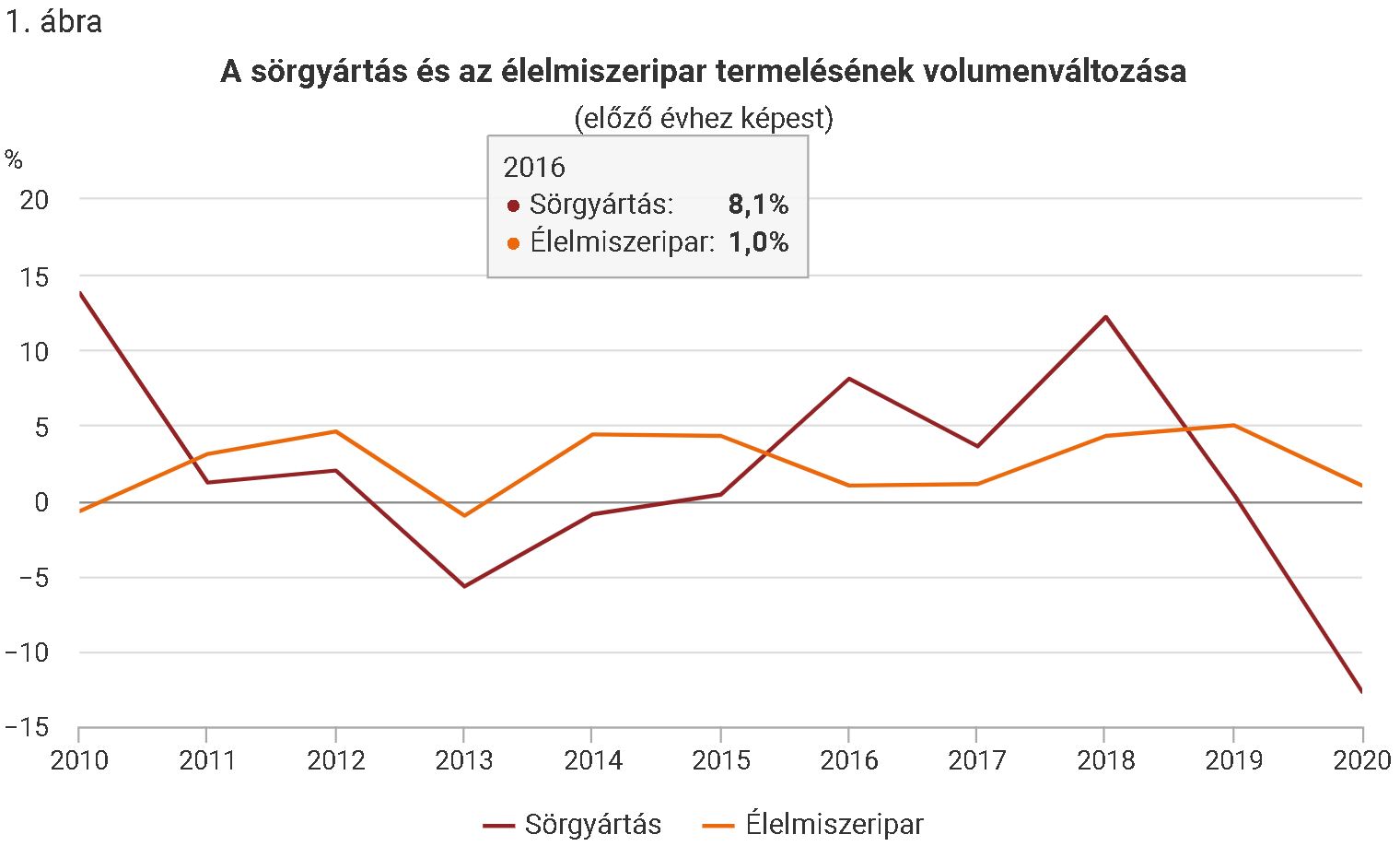 A sörgyártás a 2010-es évek első felében változatosan alakult, majd 2015 és 2019 között folyamatosan nőtt. 2020-ban azonban a kibocsátás (100,3 milliárd forint) volumene a 2010-es években nem tapasztalt mértékben, 13%-kal visszaesett. A nagymértékű csökkenést jelentős részben a Covid19-járvány miatti fogyasztáskiesés okozta. A korlátozások nyomán a tavaszi és a késő őszi hónapokban a vendéglátóegységek bezártak, vagy csak korlátozottan fogadhattak vendégeket, a sörgyárak és a sörfőzdék által támogatott kulturális és sportrendezvények, fesztiválok, város- és falunapok pedig többnyire elmaradtak. 2020-ban az élelmiszeripari kibocsátás 2,6%-át adta a sörgyártás.