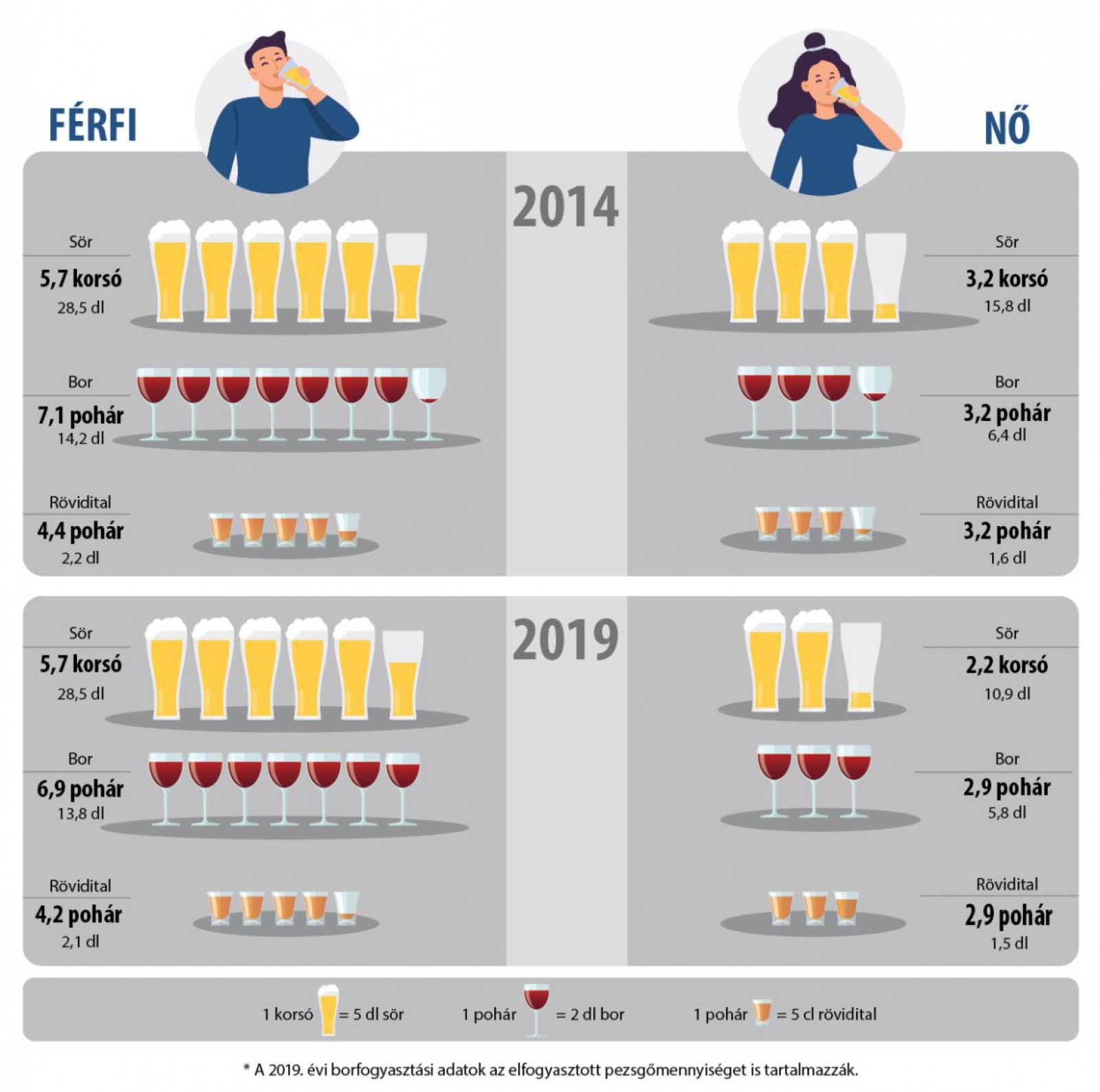 Az Európai lakossági egészségfelmérés eredményei szerint. A 15 éves és annál idősebb magyarok egynegyede fogyasztott hetente legalább egyszer alkoholtartalmú italt, ez az arány alig tér el a 2014. évitől (24%). Leginkább a férfiakra jellemző, hogy legalább egy alkalommal a héten szeszes italt fogyasztanak: míg tíz férfi közül 4 ivott ilyen rendszerességgel alkoholt 2019-ben, addig a nők csupán 12%-áról mondható el ugyanez. A férfiak szinte minden alkoholfajtából közel ugyanannyit, a nők különösen sörből kevesebbet fogyasztottak 2019-ben egy átlagos héten, mint öt évvel azelőtt.