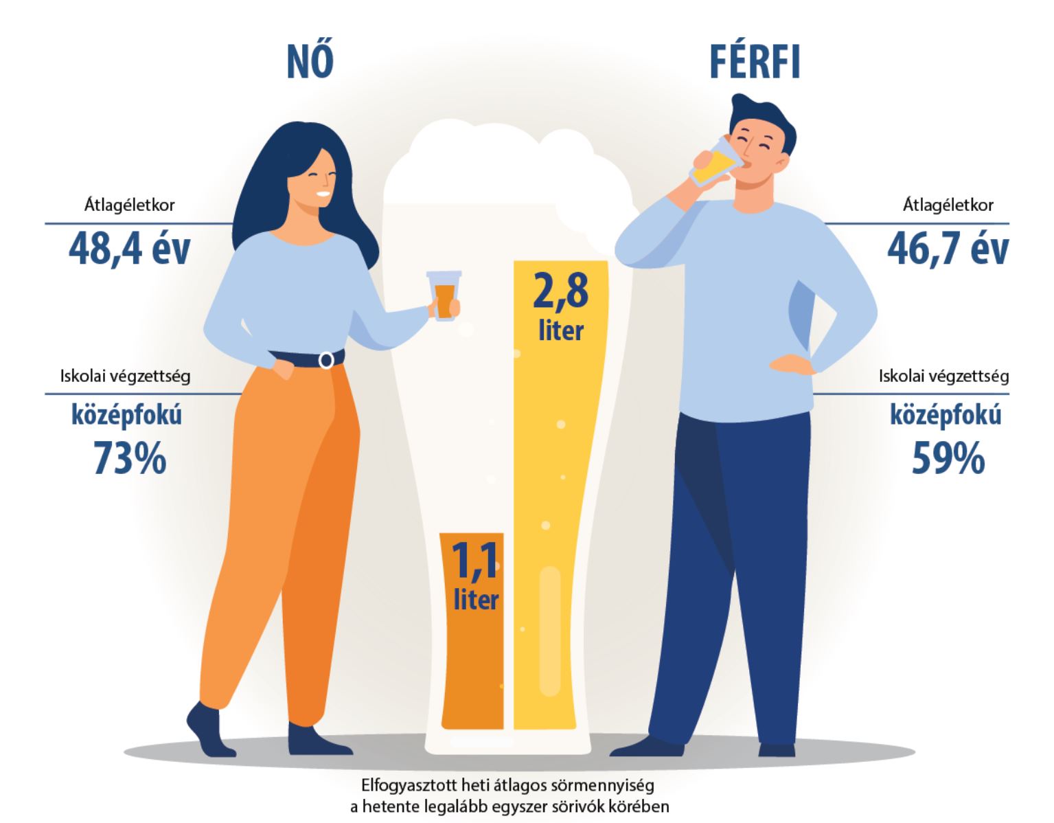 A sör népszerűségét jelzi az is, hogy azok közül, akik 2019-ben legalább hetente egyszer fogyasztottak szeszes italt, 63%-uk ivott sört (is). A legalább heti egy alkalommal valamilyen sörkészítményt fogyasztók túlnyomó többsége férfi (86%). Az átlagos sörfogyasztó férfiAz Európai lakossági egészségfelmérés eredményei szerint.[4] 47 éves, középfokú végzettséggel rendelkezik (59%), hetente átlagosan 2,8 liter sört iszik. A sörivó férfiak átlagéletkora szinte megegyezik a 15 éves és annál idősebb népesség jellemzőjével (46,3 év), a nőké némileg alacsonyabb annál (50,1 év). A legalább heti egyszer sört fogyasztó férfiak iskolai végzettsége az átlagnak megfelelően alakul, hiszen arányaiban közel ugyanannyian rendelkeznek középfokú végzettséggel, mint a 15 éves és annál idősebb férfiak (60%). A sörivó nők között viszont a 15 éves és annál idősebb nőkhöz képest (52%) felül vannak reprezentálva a középfokú végzettségűek.