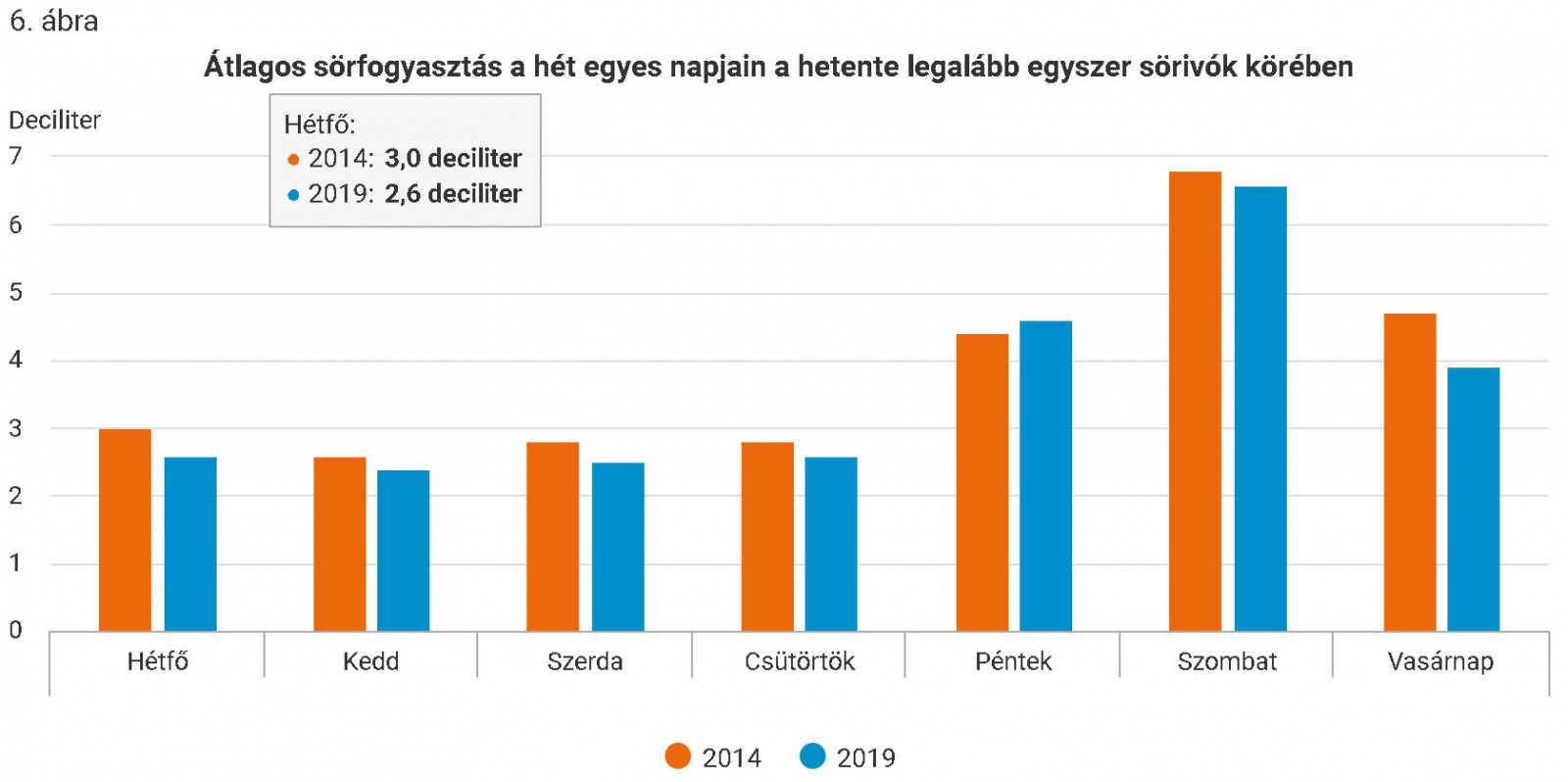 A hétfőtől többnyire csütörtökig tartó mérsékelt sörfogyasztás a hétvégéhez közeledve pénteken némileg megemelkedik. A 2014. évi adatfelvételhez hasonlóan 2019-ben is szombaton volt a legmagasabb (6,6 deciliter), kedden a legalacsonyabb (2,4 deciliter) az elfogyasztott sörmennyiség. Bár a hetente legalább egyszer sört fogyasztók aránya a 15 éves és annál idősebbek körében 2014 és 2019 között 14%-ról 16%-ra emelkedett, egy átlagos héten mégis kevesebb sört iszunk, mint azelőtt. Úgy tűnik, hogy a magyarokat a korábbiaknál mértéktartóbb sörfogyasztás jellemzi, ami vélhetően a növekvő sörárakkal, valamint a lakosság alkoholfogyasztási szokásainak kedvezőbbé, tudatosabbá válásával is összefüggésbe hozható.