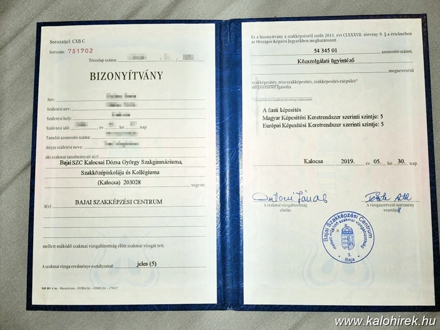 Tizenegy, a húszas éveiben járó fiatal május 30-án, szerdán ünnepélyes keretek között, érettségi, majd két év tanulás, a tegnapi szóbeli szakmai záróvizsga után vette át közszolgálati ügyintézői bizonyítványát a Bajai SZC Kalocsai Dózsa György Szakgimnáziuma, Szakközépiskolája és Kollégiuma intézményben. A Dózsában ezen a szakirányon első alkalommal végzett fiatalok az írásbeli szakmai, majd a gyakorlati vizsgát követően, szerdán háromtagú vizsgabizottság előtt adtak számot az elmúlt két év alatt megszerzett tudásukról.