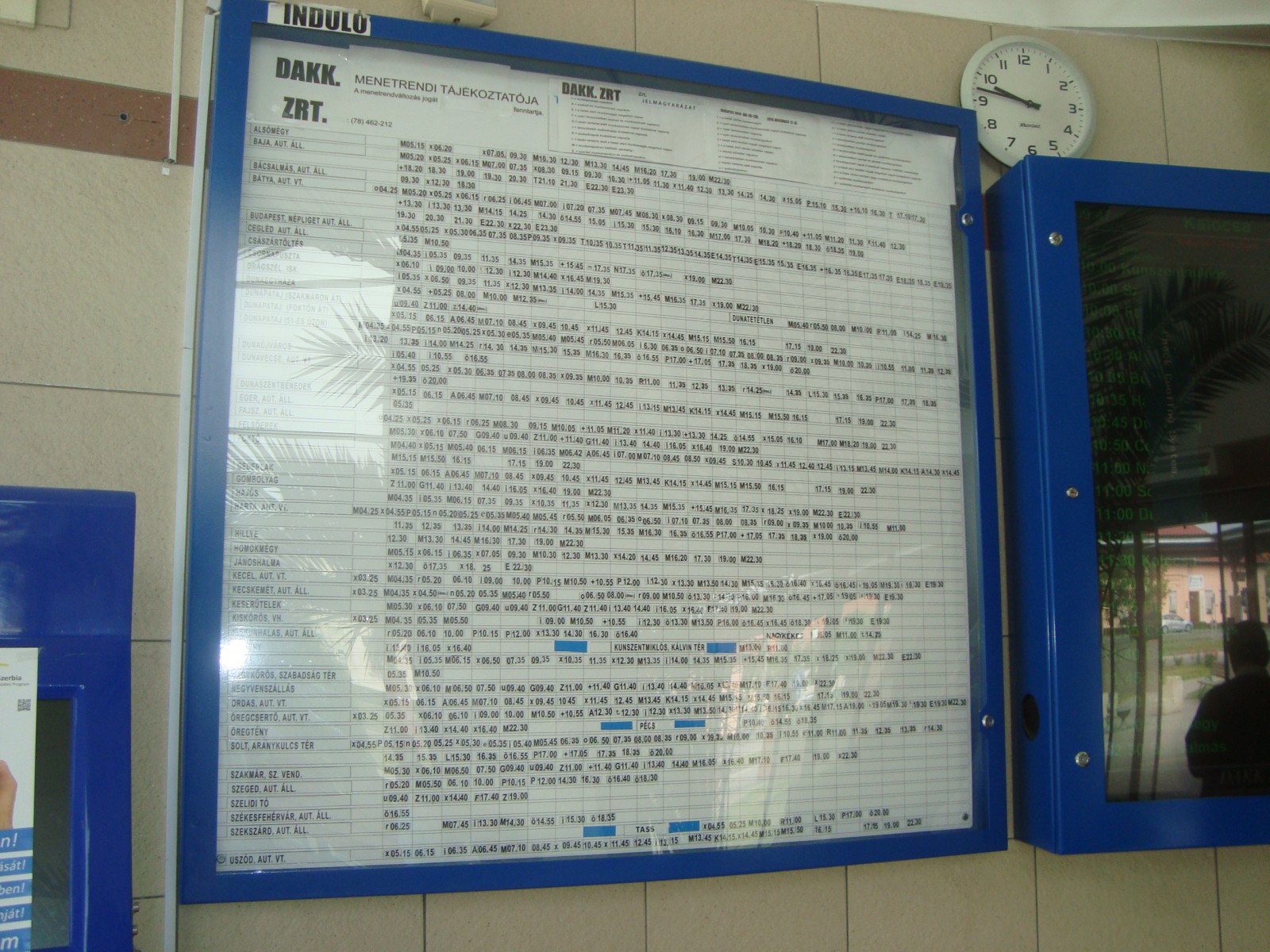 A diák utasforgalom a KunságVOLÁN buszok esetében is meghatározó, így nem csodálkoztunk, hogy a központi buszmegállóban délelőtt csak néhány utassal, parkoló autóbusszal találkoztunk. Az érvényes menetrend akár a társaság honlapján (kunsagvolan.hu), a kiadott tájékoztató füzetekben, vagy a megállóhelyek oszlopain kihelyezett statikus menetrendi tájékoztatókon is megtekinthető. Aki rosszul lát, és az utóbbi helyen akarja megnézni az indulás időpontját, annak célszerű, ha szemüveget visz magával.