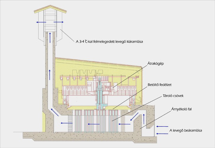 A létesítmény a kéményben is áramló levegő elvére épít, az áramló levegő hűti a már elhasznált, kiégett, fénykorukban az atomerőmű meghajtását biztosító kazettákat.
