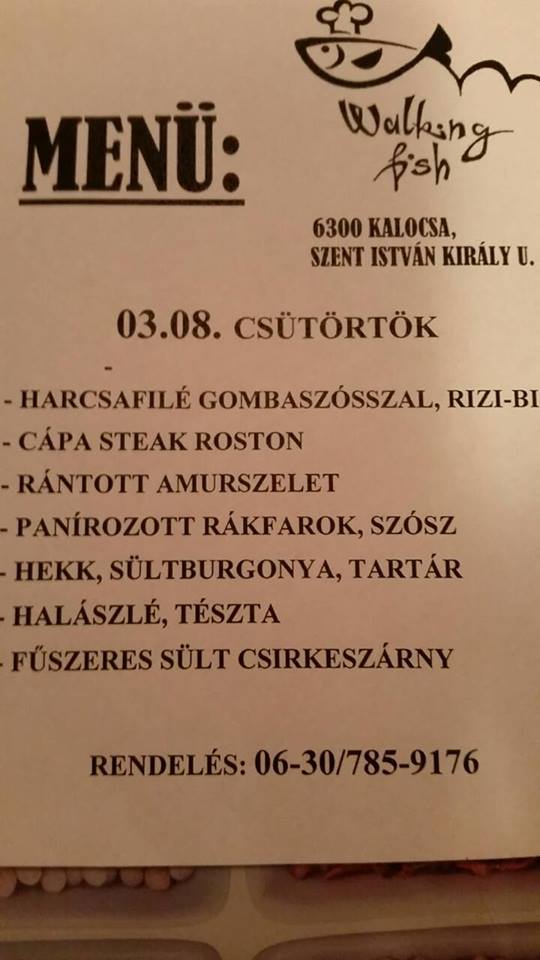 Különleges halételekkel és ínyenc fogásokkal várnak téged is a forradalmian új szemléletű Walking Fishben, ahol hétről hétre, finomabbnál finomabb gasztro-csemegékkel találkozhatsz. Na itt tuti, hogy „lekenyereznek”. Tengeri herkentyűs spagetti, harcsapöri sztrapacskával, sült hekk-kárász, sziki pontyból készült halászlé, rántott tintahal karika, ropogós saláta rákfalatkákkal-ínyenc mártással, és még sorolhatnánk...! Ha lecserélnéd az uzsit és ennél végre valami igazán jót, akkor tudod mit kell T-ENNED! Kattints a részletekért, mindent elárulunk!