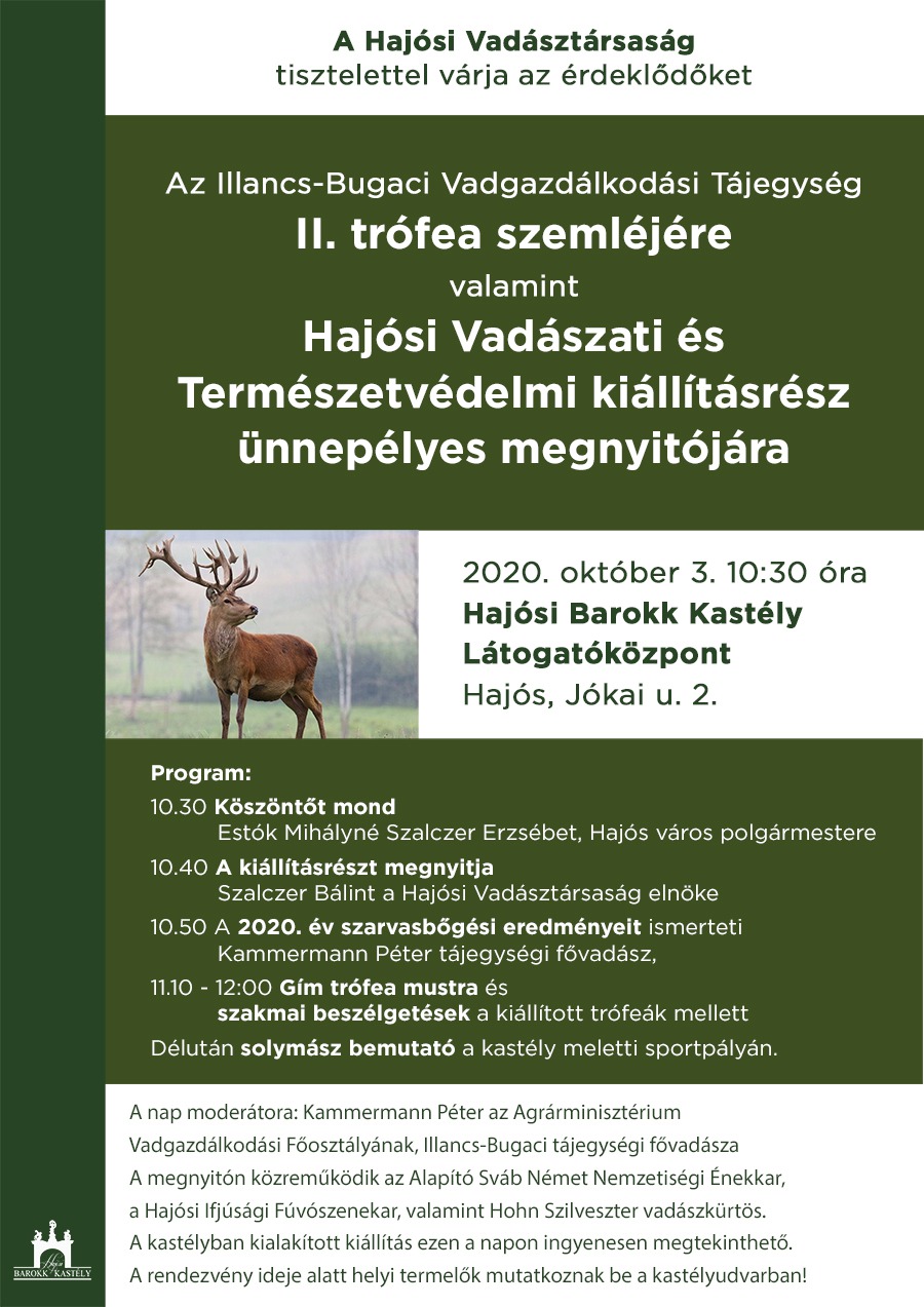 A Hajós Vadásztársaság szervezésében október 3-án, 10:30 órakor a Hajósi Barokk Kastély Látogatóközpontban ünnepélyes keretek között nyitják meg a Vadászati és Természetvédelmi kiállításrészt.