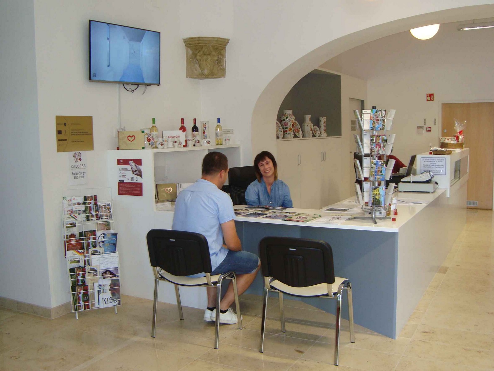 A Látogatóközpont fogadótere már önmagában is beszédes, hiszen a polcokon minden olyan termék megtalálható, és természetesen megvásárolható, amelyet a fűszerpaprikától a pingáláson, varráson át a porcelánig, a kalocsai motívumokkal díszített ruhadarabokig helyi népművészek és kézművesek készítenek. Az egyik sarokban a kortárs művészek alkotásai is helyet kaptak.