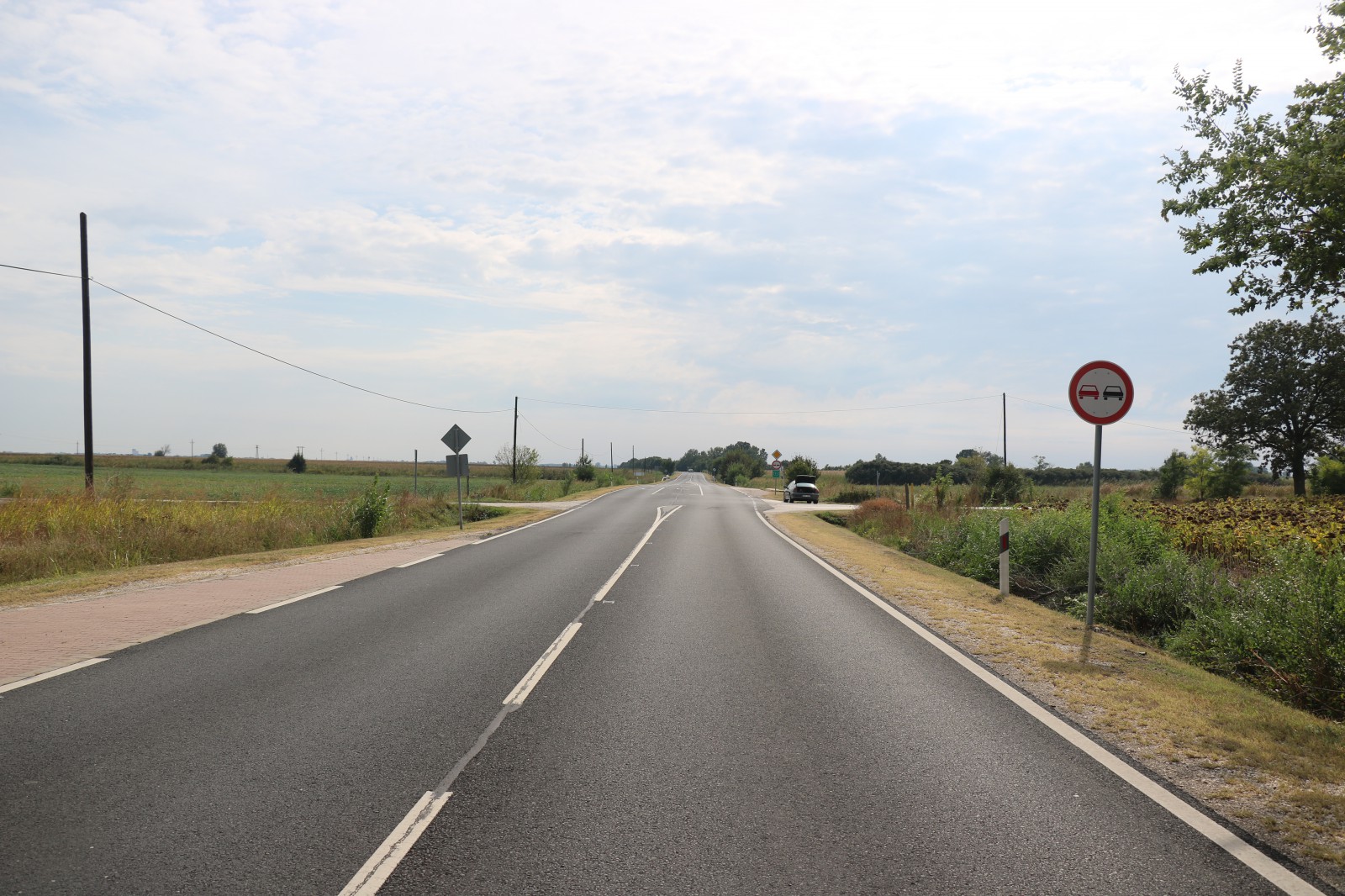 AZ ÚT EZEN KISZÉLESEDŐ SZAKASZA ELŐTT ELŐZNI TILOS TÁBLA VAN, DE AZ ELŐZÉSI TILALOMNAK EGY JÓL LÁTHATÓAN FELFESTETT ZÁRÓVONAL IS NYOMATÉKOT AD.