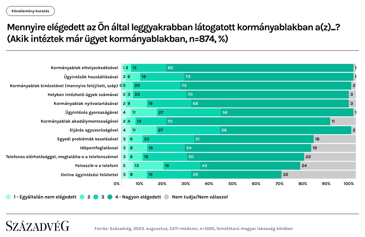 A megkérdezettek közel 80 százaléka nagyon elégedett, 15 százaléka pedig jónak véli a kormányablakok megközelíthetőségét. Az ügyféltérrel és az intézhető ügyek számával 93 százalék elégedett, de az ügyintézők hozzáállása is kimagaslóan pozitív értékeléseket kapott.
