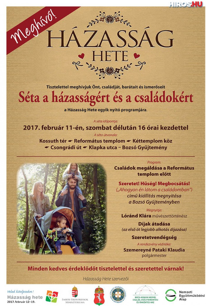 A Házasság hete nemzetközi programsorozathoz 2008 óta hazánkban is egyre több település csatlakozik. Angliából indult el az a kezdeményezés, mely Valentin-nap környékén minden évben egy hétig a házasság, vagyis az elkötelezett szerelem fontosságára irányítja az emberek figyelmét. Magyarországon a programot a Magyar Evangéliumi Szövetség (Aliansz) és a Magyarországi Egyházak Ökumenikus Tanácsa honosította meg. A központi honlapon: www.hazassaghete.hu megtalálható a különböző települések színes kínálata. A programsorozat keretében ismét megrendezik a Szerelem Íze Vacsoraestet az Aranyhomok Szállodában, egy új flashmobot a Piacon, és az évek óta nagyon népszerű Szerelmi kalandtúrát, amelyen tavaly 150 pár vett részt.