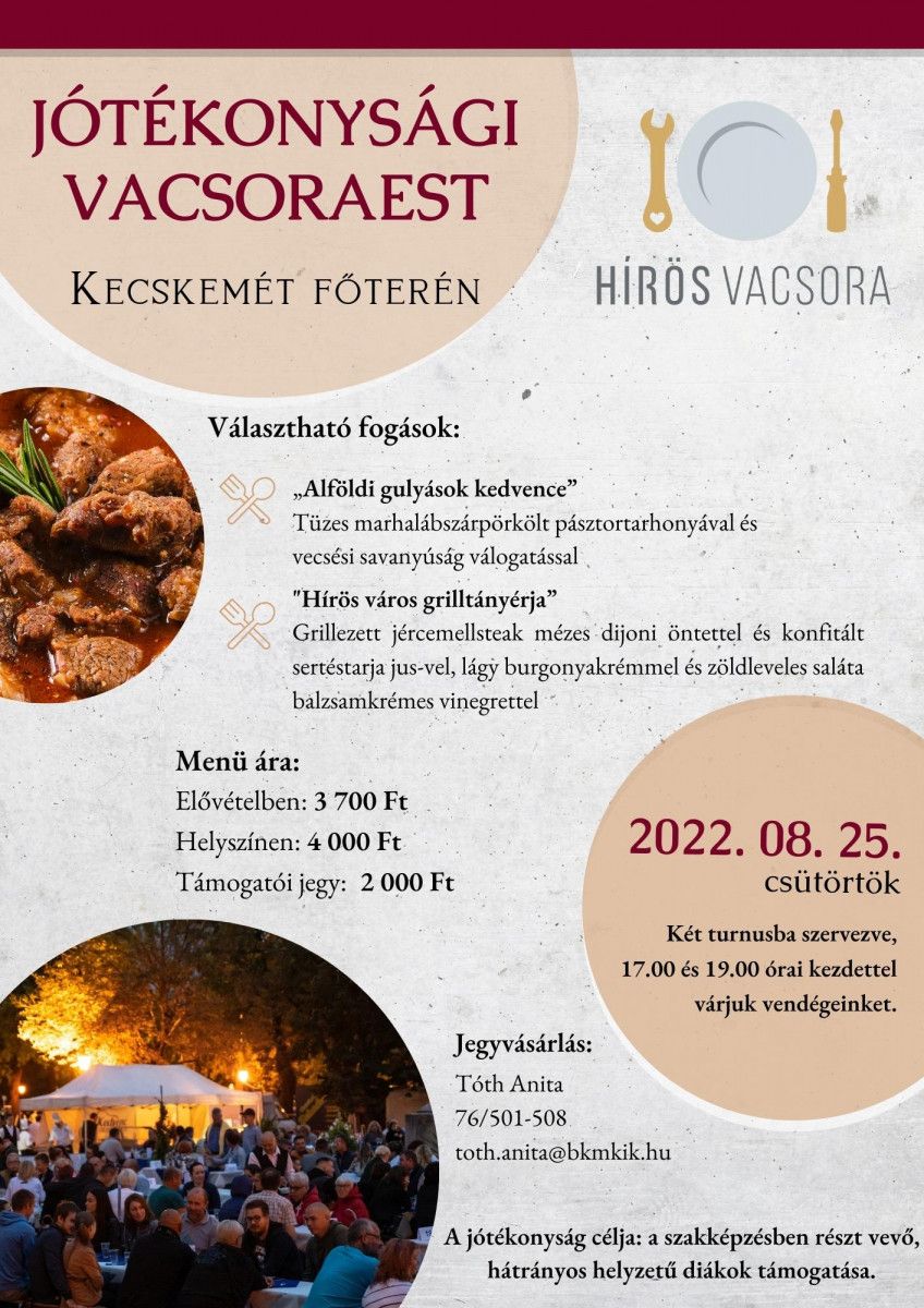 A Bács-Kiskun Megyei Kereskedelmi és Iparkamara idén is megtartja a Hírös Vacsorát, mellyel ezúttal is a tanulni vágyó, nehéz szociális körülmények között élő diákokat kívánják segíteni. A Kamara augusztus 25-én, csütörtökön 14. alkalommal hívja tagjait és a vállalkozókat a jótékonysági Hírös Vacsorára, amelyet a Kecskeméti Csárda csapatával közösen, Kecskemét főterén két turnusban tartanak majd.