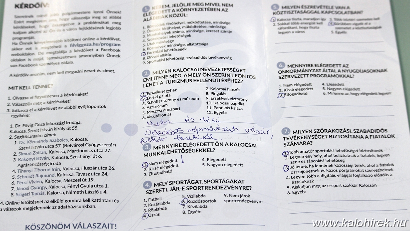 A mi kérdőíveink arra irányulnak, az a célja, hogy ebből szeretnénk megalkotni dr. Filvig Géza polgármester-jelöltünk programját."A másik fontos célunk, amennyiben megválasztják dr. Filvig Gézát polgármesternek, a lehető legszélesebben tudja szolgálni Kalocsa lakosságát.