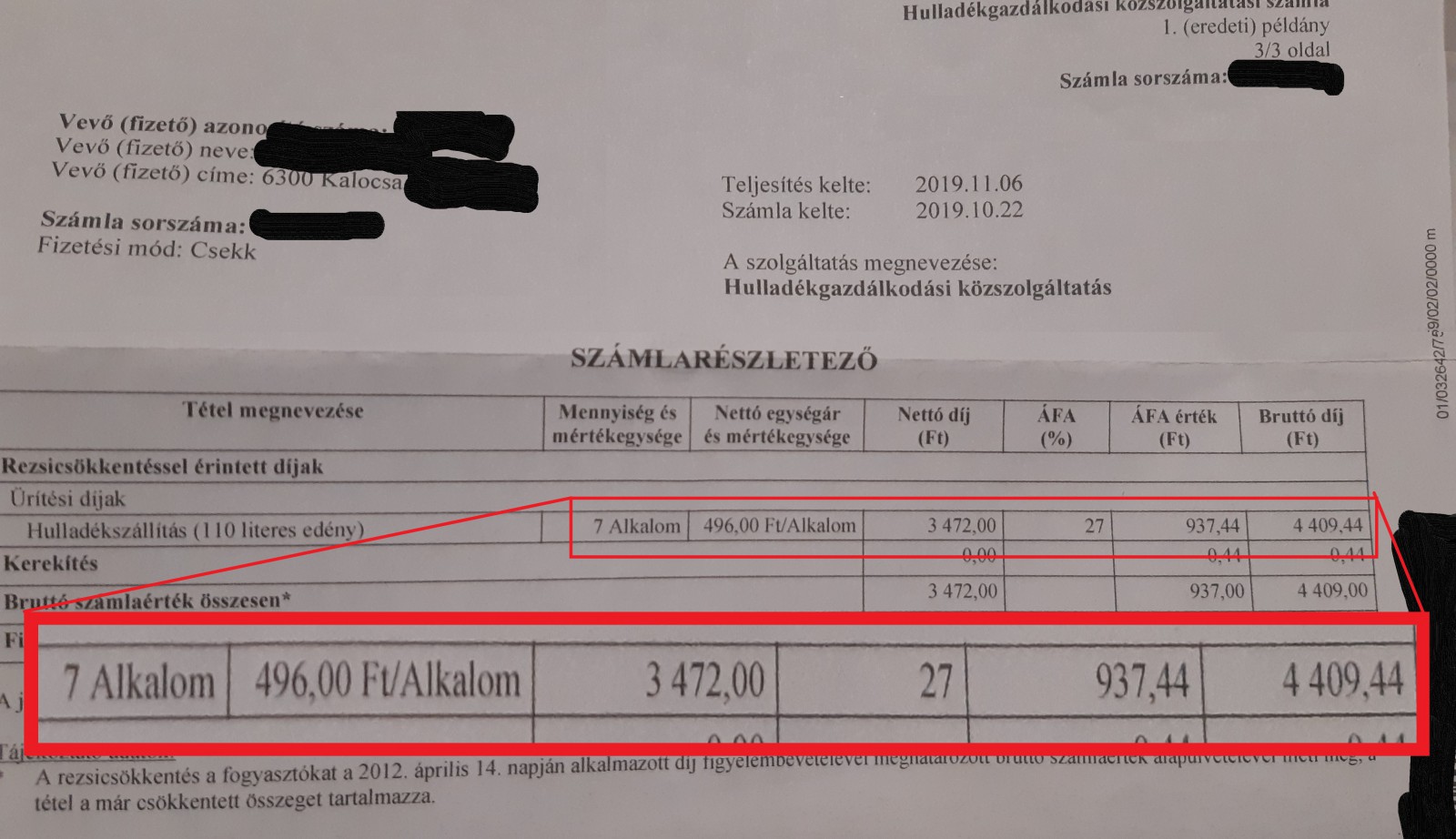 A hulladékszállító vállalat egy, a közelmúltban, egy kalocsai háztartás számára kiküldött számláján 110 literes edényre vonatkozóan 4.409 forint szerepelt mint a rezsicsökkentés figyelembevételével kalkulált, ténylegesen fizetendő bruttó összeg.