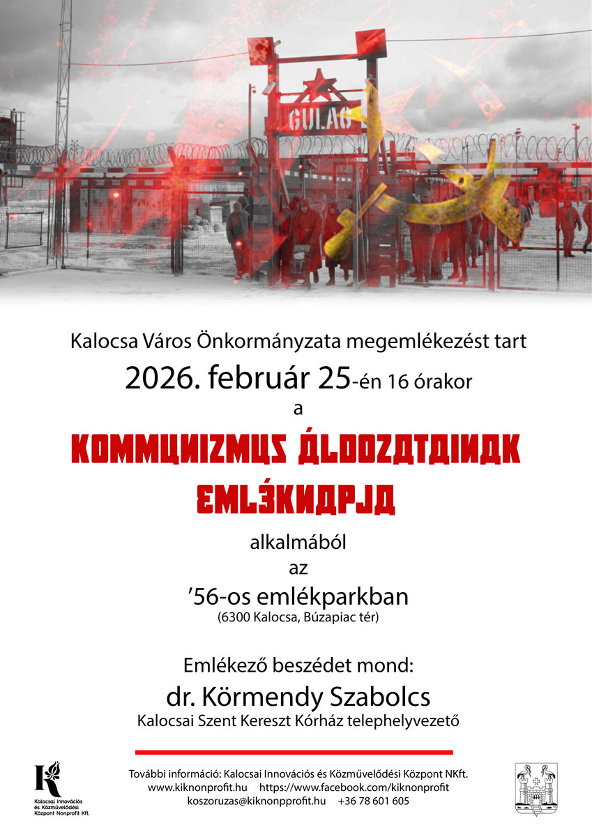 Kalocsa Város Önkormányzata 2026. február 25-én, szerdán 16 órától tart megemlékezést a kommunizmus áldozatainak emléknapja alkalmából az ’56-os emlékparkban.