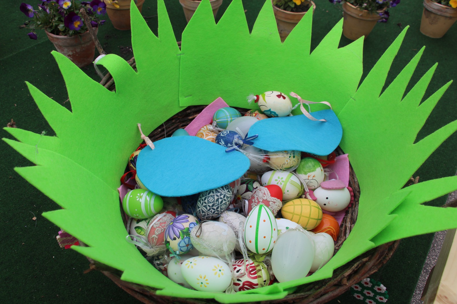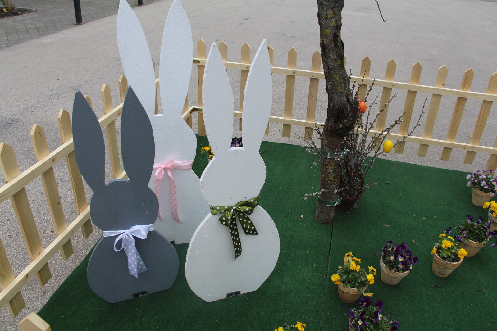 A tojásfa mellett karton nyuszik őrzik a nyuszifészket, amelyben festett, pingált, csipkével dekorált tojások mutatják, mily sokféleképpen készülhet hímes tojás a locsolóknak, vagy akár csak asztali dísz gyanánt az ünnepre.