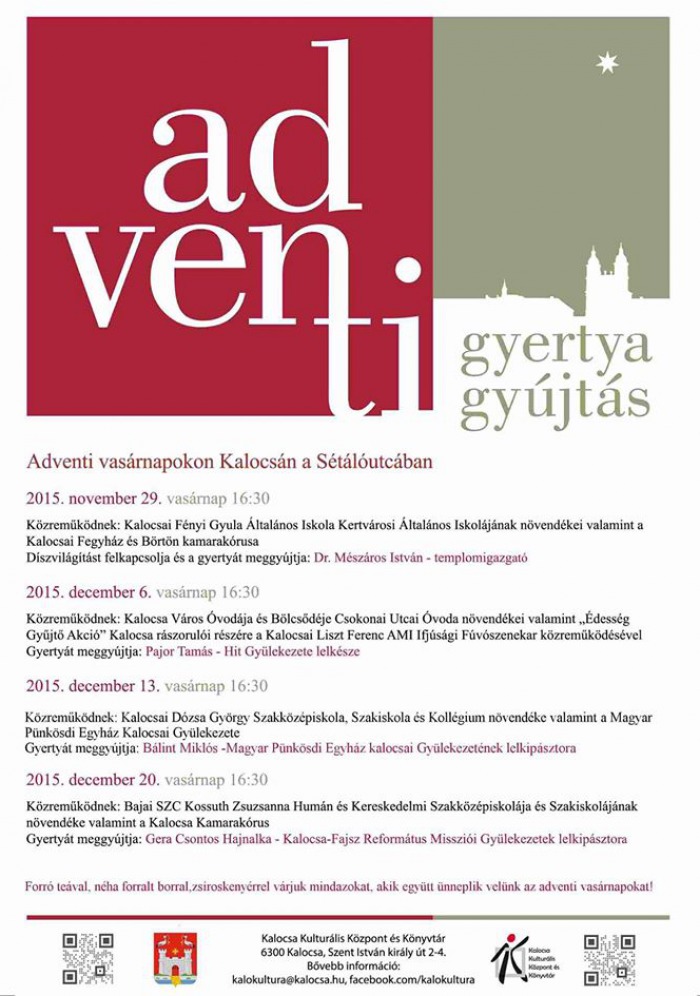 Advent negyedik vasárnapján a kulturális műsorban közreműködik a Bajai SZC KOssuth Zsuzsanna Humán és Kereskedelmi Szakközépiskolája és Szakiskolájának növendéke valamint a Kalocsa Kamarakórus. A gyertyát Gera Csontos Hajnalka, a Kalocsa-Fajsz Református Missziói Gyülekezetek lelkipásztora fogja meggyújtani.