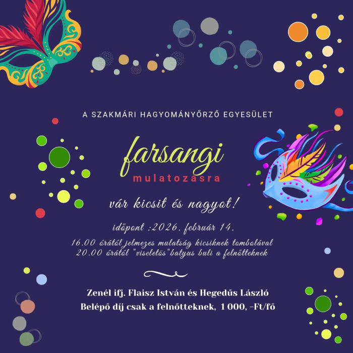 A farsang a vidámság, az összetartozás és a hagyományok időszaka – ezt a hangulatot idézi meg a Szakmári Hagyományőrző Egyesület idei rendezvénye is. A szervezők szeretettel várnak minden érdeklődőt egy színes, jókedvű farsangi mulatozásra.