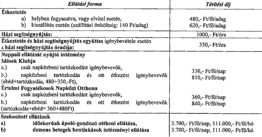 Ennek intézményi térítési díja változatlanul 1000 Ft óránként. Az étkeztetés és házi segítségnyújtás együttes igénybevételének esetén a házi gondozás óradíja 10 százalékkal, 300 Ft-ról 330 Ft-ra nő óránként.
