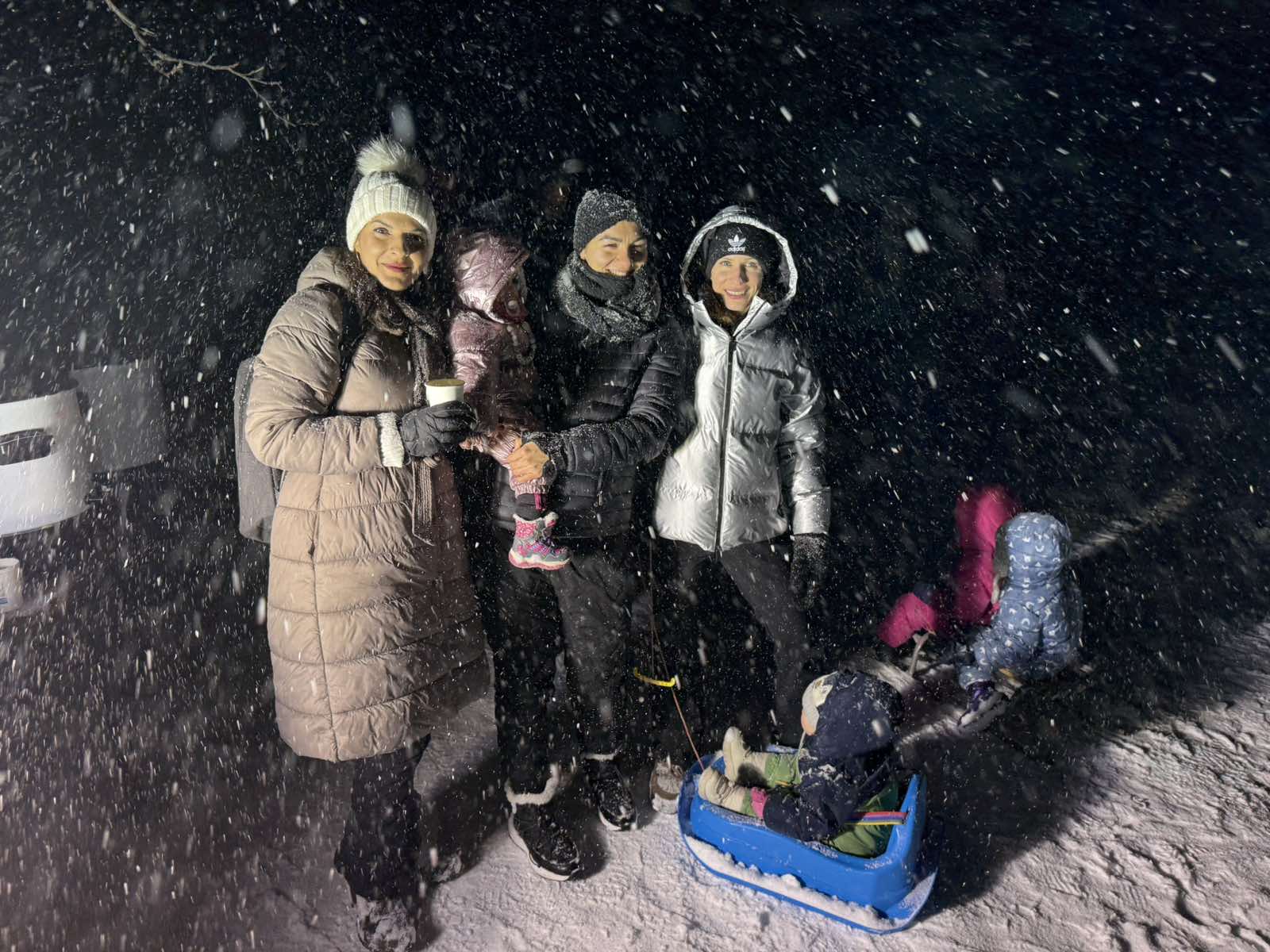 Forró teával, forralt borral, zenével és kivilágított pályával várták a családokat hétfő este a szakadó hóesésben, a gyermekek pedig hamar fel is pattantak szánkóikra, hogy birtokba vegyék a pályát.