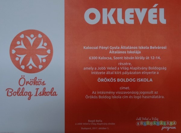 Az iskola 2016 júliusában kapta meg a Boldog Iskola címet, s ezután pályáztak az Örökös Boldog Iskola elismerésre, melynek kritériuma az volt, hogy az iskolában legalább három osztályban a program szerint kell dolgozni.